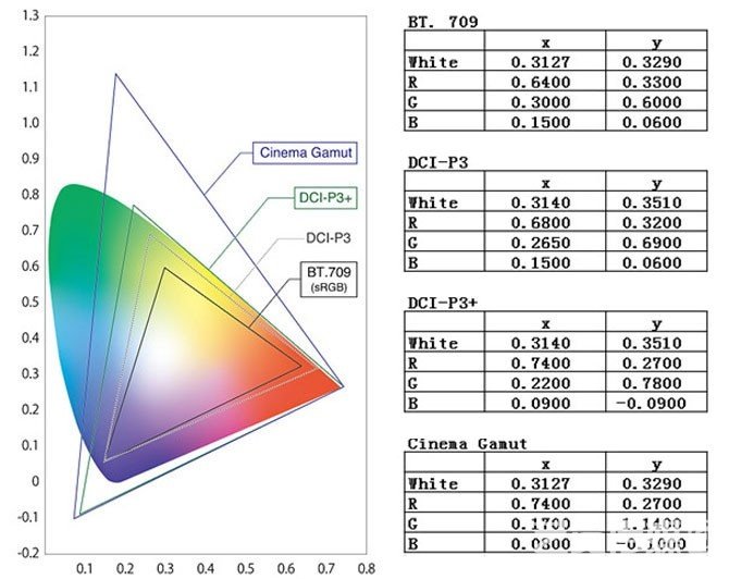 我們從上面的兩張圖,可以明顯的看到BT.2020已經(jīng)十分接近電影放映的DCI標(biāo)準(zhǔn),甚至在深綠色的表達(dá)上已經(jīng)超越的DCI標(biāo)準(zhǔn)。